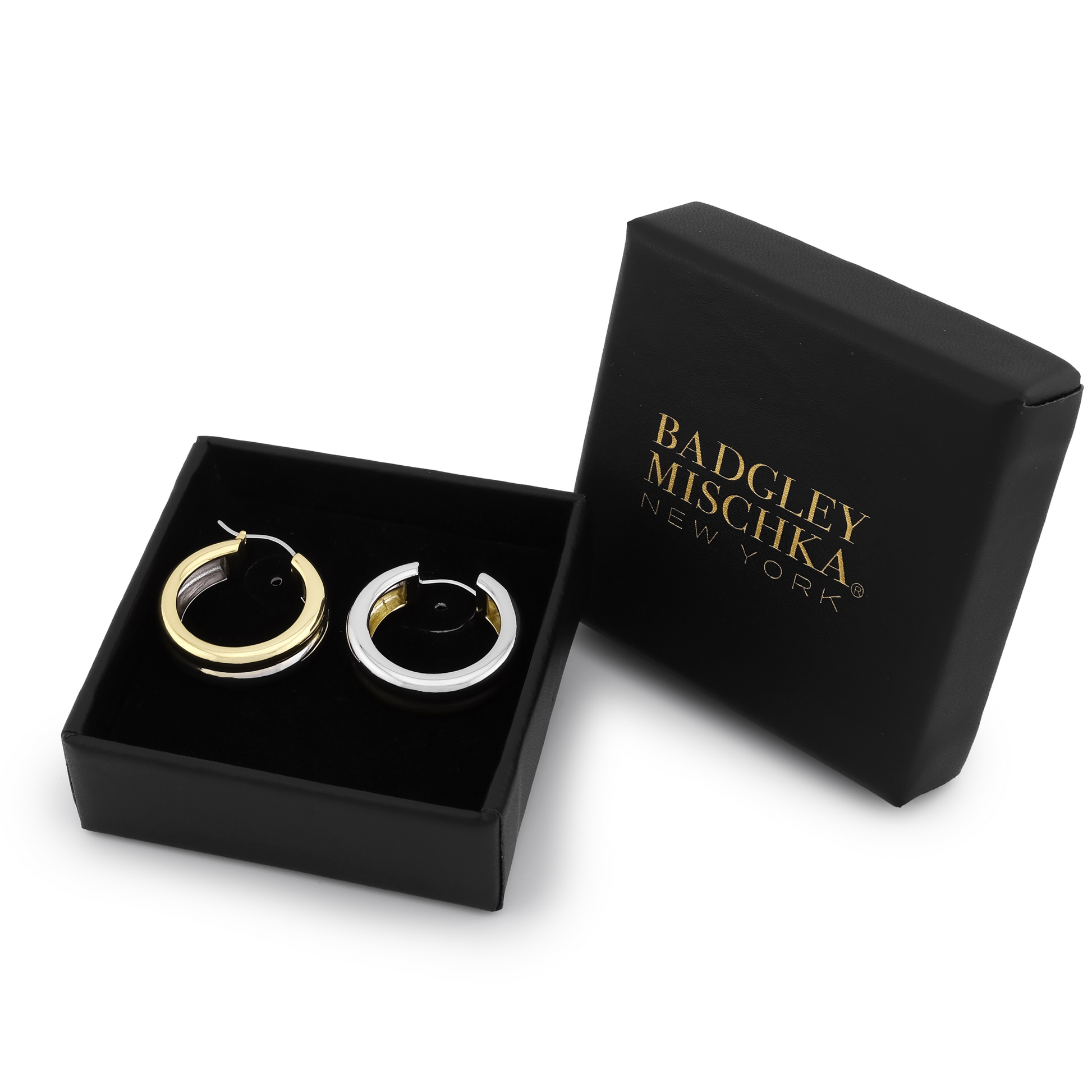 Sculptural double hoops in mixed silver and gold tones bring modern elegance to these Bianca Collection earrings. A 25mm profile with stainless-steel ear pins ensures comfortable wear while adding a statement finish.
