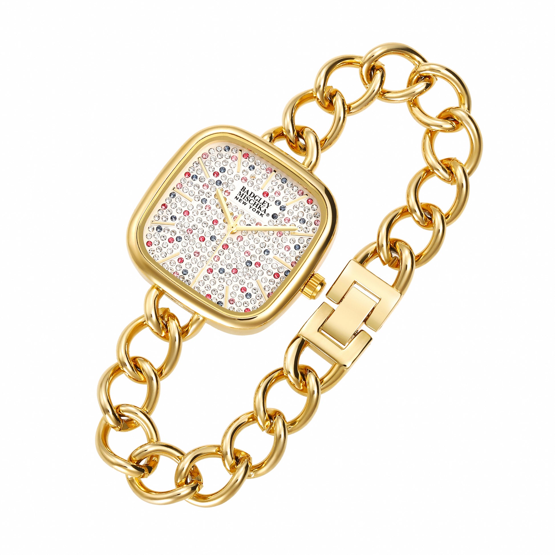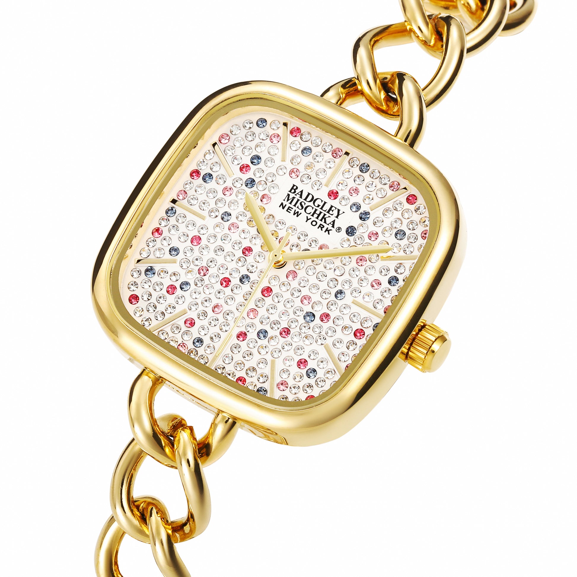 From the Badgley Mischka New York Women’s Watches collection, this square timepiece features a radiant pavé dial in jewel-toned crystals, framed in polished gold. A sleek link bracelet and precision Japanese movement complete the look with classic refinement.