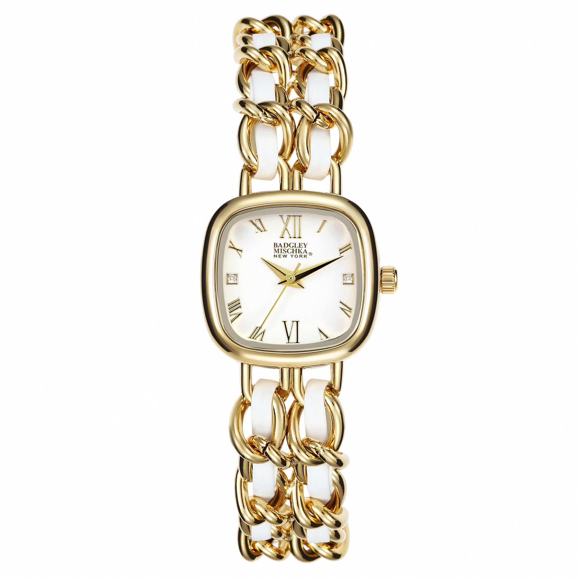 Gold-tone chain links interwoven with white leather give the luxe chain watch, from the Tara Collection, a bold yet elegant presence. Roman numerals and a white dial bring timeless sophistication to this statement piece.
